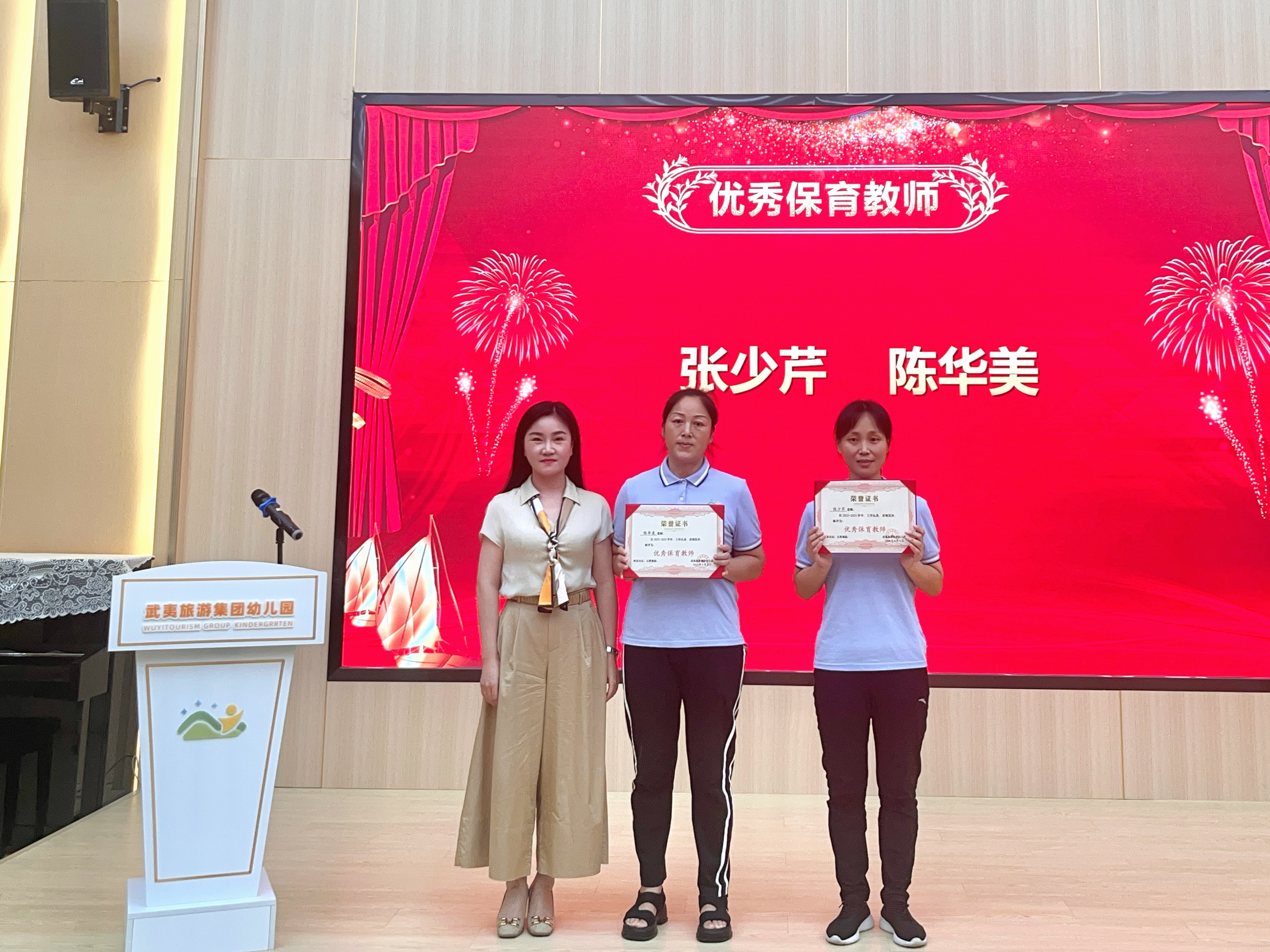 武夷人才教育科技有限公司副總經(jīng)理林彩赟為榮獲“集團(tuán)幼兒園優(yōu)秀保育教師”的兩位教師頒發(fā)證書(shū)