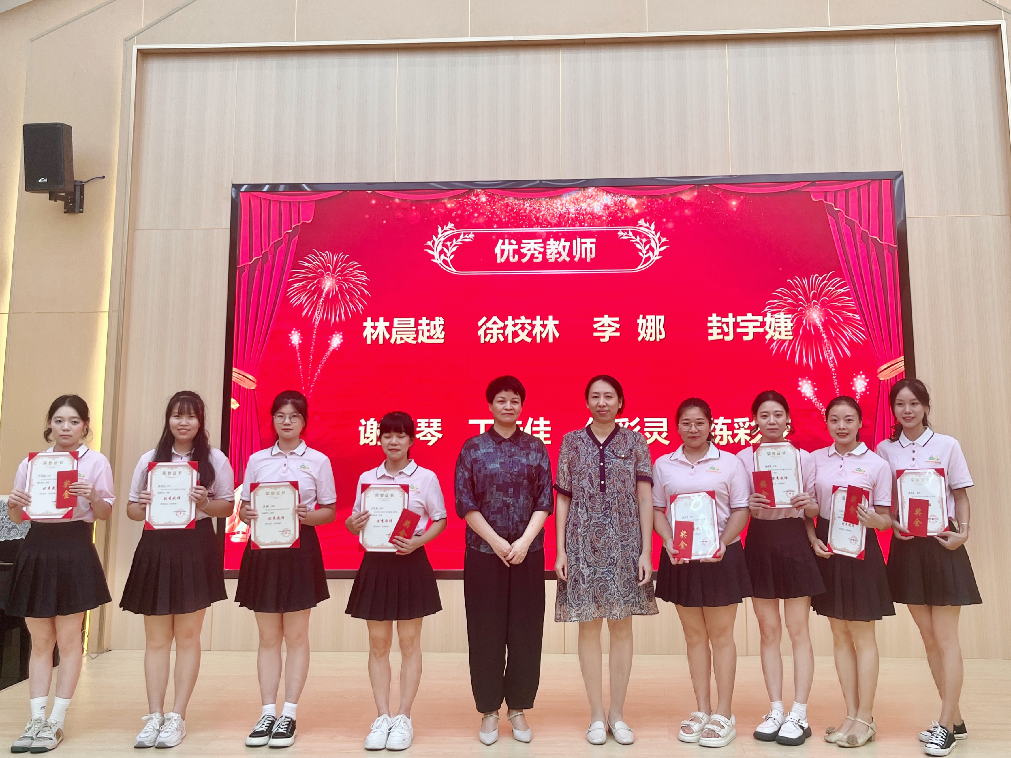集團(tuán)總經(jīng)理許周妹、黨委副書(shū)記熊文穎為榮獲“集團(tuán)幼兒園優(yōu)秀教師”榮譽(yù)稱號(hào)的八位教師頒發(fā)證書(shū)